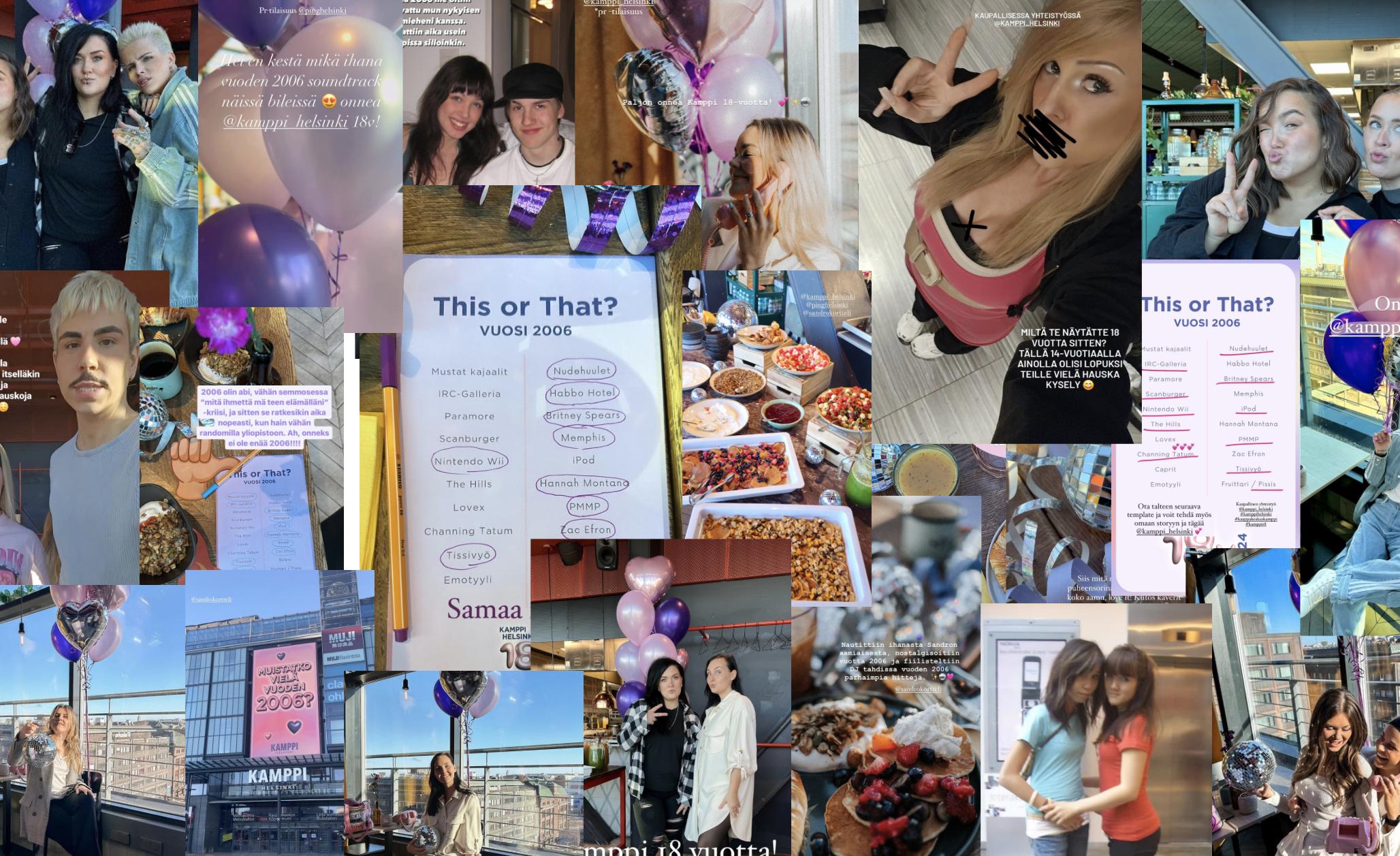 Kauppakeskus Kamppi halusi vahvistaa näkyvyyttään 18-vuotissyntymäpäiviensä yhteydessä vaikuttajayhteistyön avulla. PING Helsinki pääsi toteuttamaan nostalgiateeman ympärille rakennetun kampanjakokonaisuuden, jossa yhdistyivät perinteinen someyhteistyö sekä PR-tapahtuma. Vaikuttajasisällöissä ja tapahtumassa muisteltiin vuotta 2006, jolloin Kamppi perustettiin. Kampanjan ja tapahtuman yhdistelmällä saatiin aikaan korkea kohderyhmän tavoittavuus ja sitouttavaa pöhinää Kampin syntymäpäiväteeman ympärille.